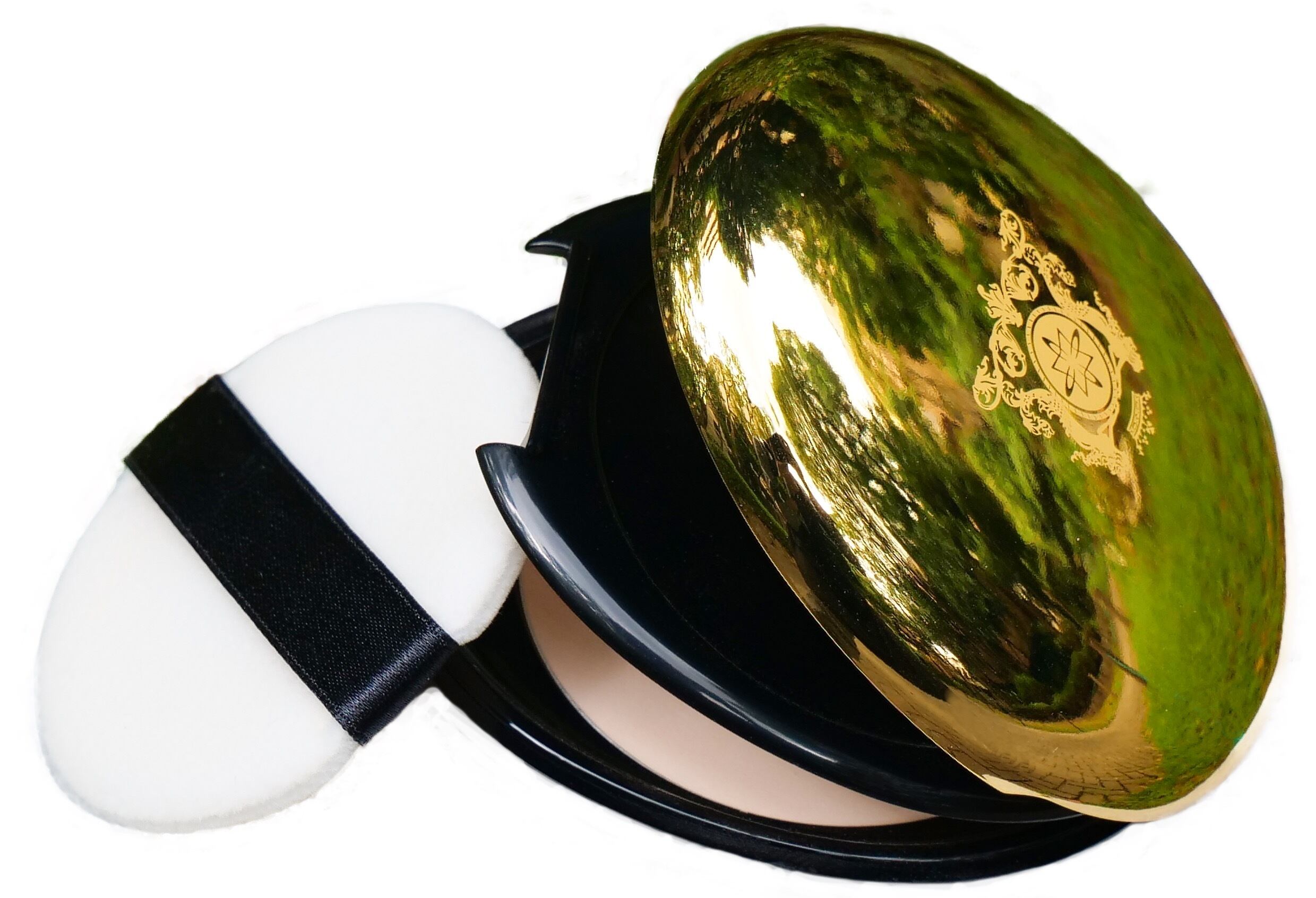 イエローゴールドとブラックを基調とした中皿のついたコンパクト。